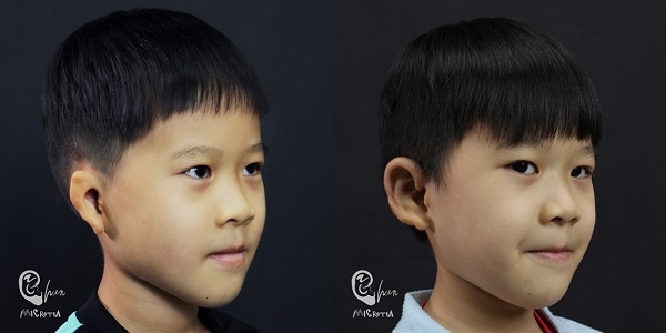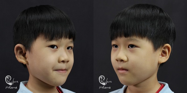 療程效果因人而異,上圖為7歲小朋友實際進行單側(右耳)小耳症手術術後之成效。